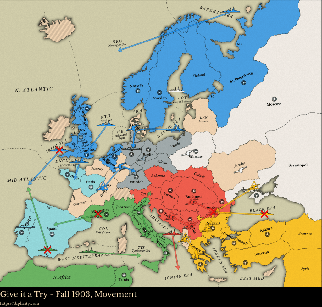 - F IRI-MAO, F ENG-BRE, F NTH-ENG, F BAR-NWG, F BAL S Den-KIe, A Bur S Ruh-Mun GAINS: Brest, Munich, Kiel – 3 builds