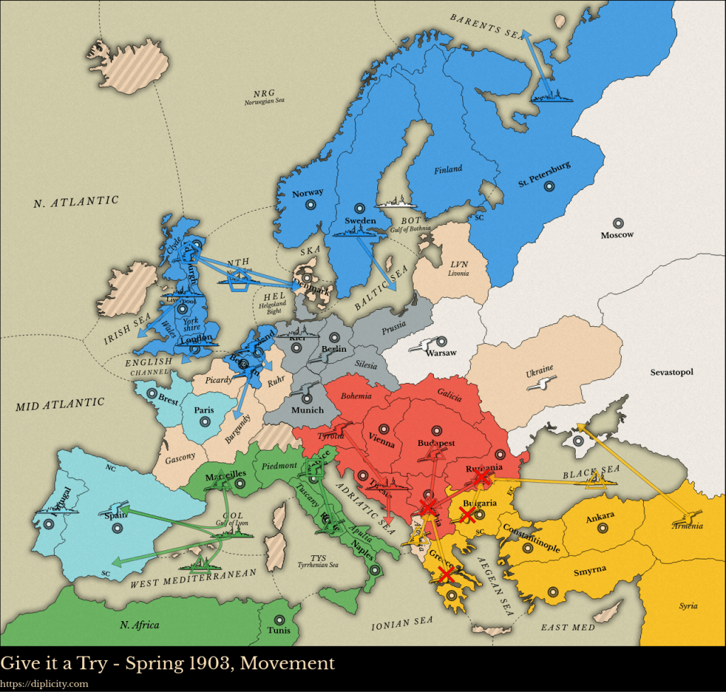 Now, I thought I was giving Turkey this advice before the end of 1903 but, as it happens, I didn’t. I’d finalised my orders – no real Diplomacy to be done – and the deadline passed quickly. So I’ll have to see how confused I’ve made Turkey!