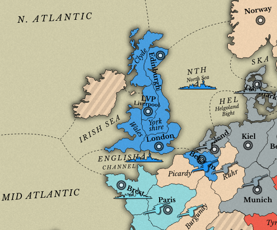 The solution to this likely dislodgement is to convoy your army out of Belgium before it happens. But where? Norway is a possibility but, by this time, Russia may well have a unit bordering Norway. Will they let you in? (They probably should, in fairness, simply because Germany is going to need somewhere else to go if they and France eliminate you, and Russia is a good option.) What about Yorkshire, London or Wales? Well, yes, that would work… but then you’ve wasted time putting it in Belgium in the first place! Perhaps it can move to Picardy? Not if France is determined to succeed in occupying Picardy, no, and isn’t stopped by German action.