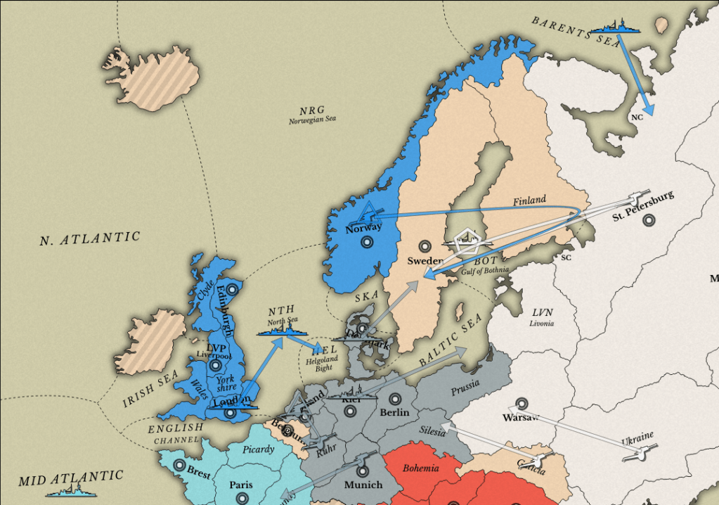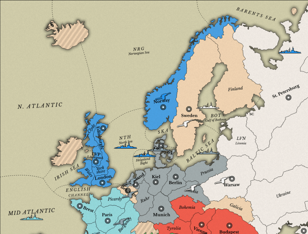 Well, they’ve started by agreeing an alliance with Russia. The terms are that England gets St Petersburg in return for Russia gaining a secure alliance with England and gains against Germany. Why would Russia agree to this? Because they can use the E/R alliance to gain German SCs – Berlin, Munich, Kiel, Sweden and Denmark – while England gains the Low Countries, Norway and St Petersburg, and a free shot on France.