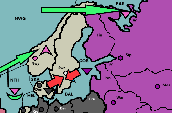 England needs to get into Norway as a start, and Germany has to get into Denmark. Ideally, England should also have a fleet in the Barents Sea, ready to move into St Petersburg. In F01, Germany needs to bounce Russia from Sweden.