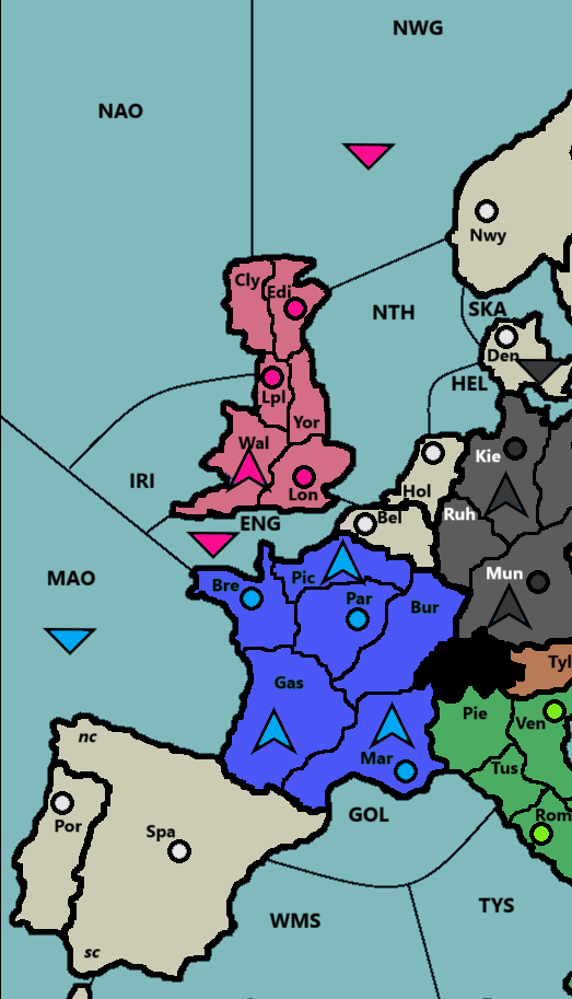 This probably means that sticking with the E/G alliance is best. And this works well for England – you’re always able to build units behind Germany and can probably afford to be more patient than Germany can.