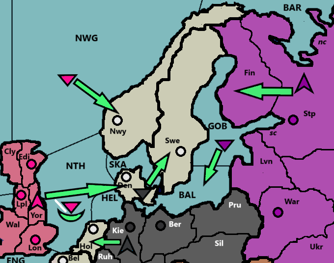 So, Germany orders F Den-Swe which succeeds. To Germany’s horror, though, Russia has moved F GOB-BAL and A Mos-Fin. They now have two units bordering Sweden. England, meanwhile, has not only succeeded with ordering F NWG-Nwy, but has also ordered F NTH C Yor-Den, which – in the playout above – has succeeded because Germany chose to order A Kie-Hol.